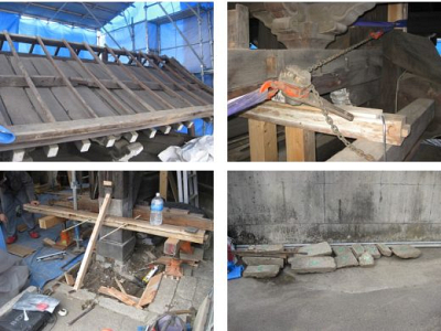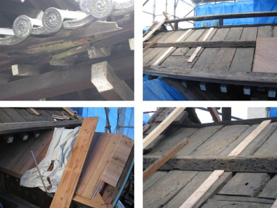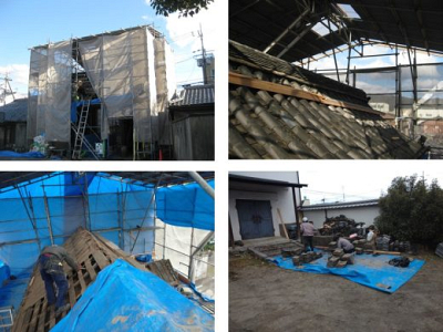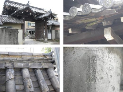 山門に素屋根がかけられ、瓦が下ろし始められています。下ろされた瓦はコツコツと金槌で叩かれ、…