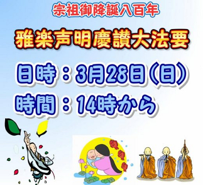 宗祖御降誕八百年 雅楽声明慶讃大法要 並 春彼岸会 日時:3月28日(日) 時間:14…