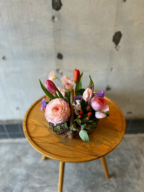 春のお花をたっぷり詰め込んだ可愛いカゴのアレンジメント🧺