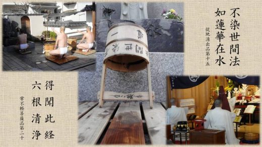 さて、アップした写真の中央部分に写っているものは何なのかお分かりでしょうか。僧侶が水行に使う水行桶(おけ)です。これを使って水行場の水槽の水を汲んで、その水を頭からかぶります。写真ではこの桶が逆さに立て掛けてありますが、これは水行の後、水を切るためです。この桶本体の上半分(写真では逆さなので下半分)に「不染世間法(ふぜんせけんぼう)」と書かれているのが確認できます。これは肝文(かんもん)と言う、水をかぶる前に誦するお経の文で、水行の目的となどを法華経の経文から選び出したものです。さらに、写真では見えていない桶の反対側には「如蓮華在水(にょれんげざいすい)」と書かれています。この「不染世間法 如蓮華在水」の経文は以下に示すように法華経の従地涌出品第十五に出てくる一文です。