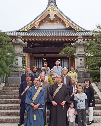 成正寺を朝8時半に出発し、阪神高速、中国道、舞鶴道を経て、福知山へと赴きました。10時半に到着し、そのまま本堂にて御開帳、縁起等のお話しをいただき、客殿にてお茶とお菓子を用意していただき、ゆっくりとさせていただきました。御住職を囲んでの記念写真の後、昼食場所である料亭「紀文」へと移りました。昼食終了後、福知山城を見学し、丹波篠山へ移動し、買い物を楽しみました。