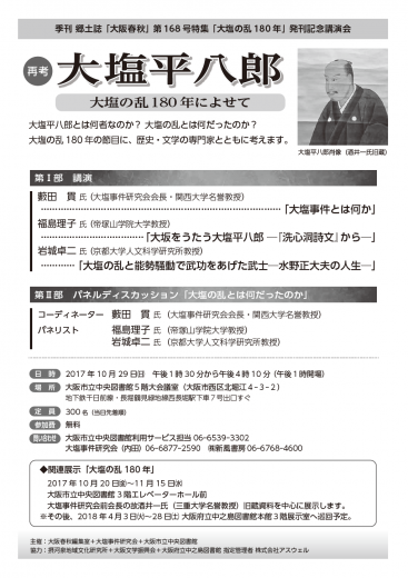 10月29日(日)13時~「大塩の乱180年記念講演会」が開催されます。 場所は、大阪市立中央図書…
