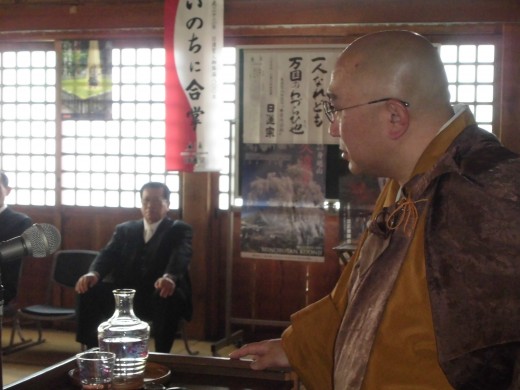11時から皆さんとご一緒に宗祖御報恩のお会式法要をお勤めした後、午後からは京都亀岡市法華寺御住職の杉若恵亮師による法話を聴聞。杉若師は、お会式にまつわる仏教的なお話から、超便利社会への提言、東日本大震災発生以来継続されている支援活動から見えて来たもの、自らが理事を務める『空援隊』(フィリピンに残されている日本兵の遺骨を持ち帰るNPO法人)での経験に基づいたエピソードなど、多岐にわたってお話を展開され、「かつての日本は祈る(意乗る)と、それに基く行動が両輪にあった。祈っては行動し、叶わなければまた祈り、そして行動する。積み上げてきた文化であり、それによって縦糸と横糸のしっかりした編み目が作られていた。今の世の中は、横の糸(物質文明)がどんどん入り込み、縦の糸(精神文化)がそれに追いついていけない。縦の糸は経度、所謂お経のことで、妙法蓮華経という縦糸が編み込まれている。数ある仏教信者の中でも妙法蓮華経を唱えている人は、どんなに物質文明が押し寄せても、縦糸がしっかり張られているから惑わされない。不染世間法 如蓮華在水、世間の法に惑わされることなく、泥水の中の蓮華の如くしっかり咲き誇るはずである。」と説かれました。