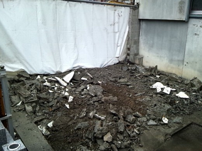 6月13日 水曜日 晴れ いよいよ解体作業の最終日。 物置の基礎と塀の基礎部分を掘り起こし、瓦礫を撤…