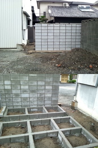6月11日 月曜日 晴れ 老朽化した物置の撤去から行います。 まず駐車場と物置の間にあるブロック塀を…