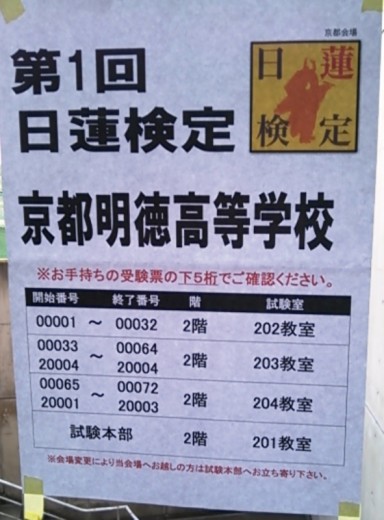 今回の日蓮検定は、東京・身延・京都の3カ所で実施されたのですが、受験番号が記載されたポスターを見ると、京都会場での受験者は76名のようですね。若い方からご高齢の方までいらしたようです。