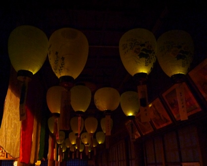 今年初盆を迎えられた檀家さんから奉納された吊り灯籠(盆提灯)を本堂の廊下に掲げ、夕方になると一つ一つに灯りを灯します。