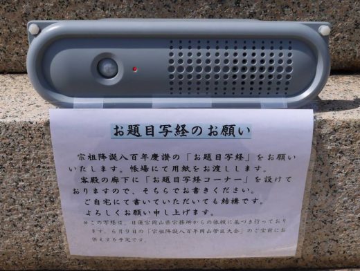 境内の香炉のそばにおしゃべり君を置いて、「ご参詣ご苦労様です。おしゃべり君です。本日はお題目写経にもご協力ください。」とアナウンスしてもらいました。