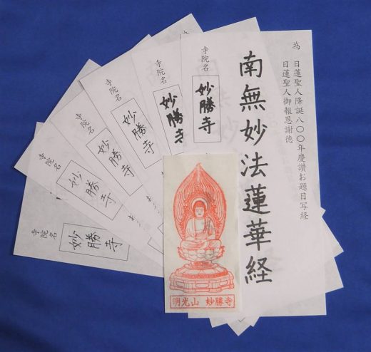 当山でも皆さまに呼びかけて、お題目写経をしていただき、882枚のお題目写経用紙を宗務所に納めました。