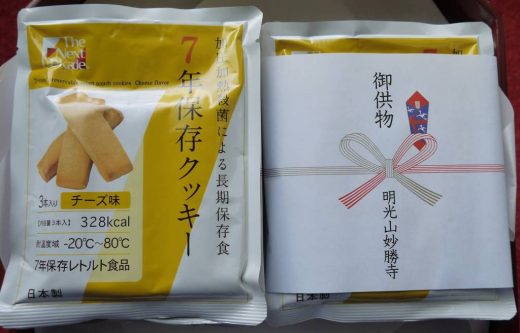令和3年秋の「仏壇備蓄」 ブログ 記事公開日:2021年09月30日 この記事は最終更新日から1年以上経過しています。記事の内容やリンク先については現在と状況が異なる場合がありますのでご注意ください。 毎年、秋のお彼岸せがき法要では、長期保存のできるお菓子などを御供物の中に加えて「仏壇備蓄」としてお配りしています。 今年は7年保存クッキーです。 今までは5年間保存できるパンやようかんが最長でしたが、今年はその記録を塗り替え7年保存です。 お仏壇にお供えしておくと、いざという時に役に立つ「仏壇備蓄」ですが、今年は「私はこれを食べる前に行ってしまいそうじゃ」との声も聞かれそうです。 この記事は最終更新日から1年以上経過しています。記事の内容やリンク先については現在と状況が異なる場合がありますのでご注意ください。 PREV NEXT 一覧へ