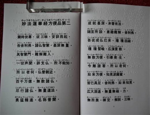 「開経偈・方便品・寿量品・唱題・宝塔偈」と日頃よく読む法華経の要文が載っており、通常の印刷とともに点字が打ってあります。