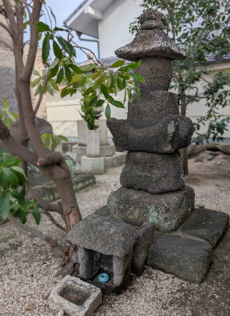 妙勝寺の境内地は昔のままかもしれませんが、建物はすべて戦災で焼失したため、戦後に再建されたものです。古い資料も残っていませんが、唯一能勢氏の遺構として残っているのは、境内にある能勢頼吉公のお墓と伝えられる石塔です。植田観樹上人もこちらのお墓にお参りされ、お題目をお唱えいただきました。