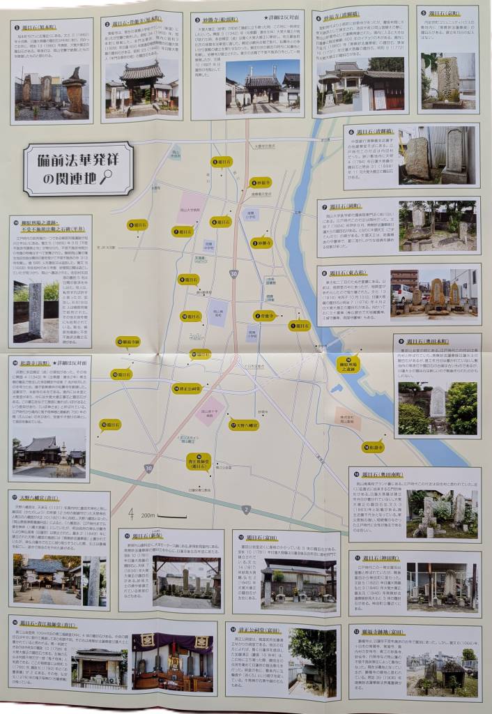 数年前、地域に残る題目石や供養塔などを詳しく調べ、マップ化したパンフレットが発行されました。『岡輝学区の歴史散歩 備前法華発祥の地を歩く』と題するパンフレットで、岡山市の岡輝学区という限定された地域(妙勝寺も含まれます)に所在する近世日蓮宗の遺構をまとめたものです。歴史の中で忘れ去られつつある遺構を記録するものとして意義あるものと思われます。