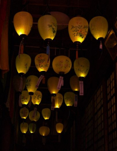 今年も妙勝寺本堂には初盆の精霊を供養するお盆の吊り灯籠が並んでいます。 8月1日から、毎夕灯り…