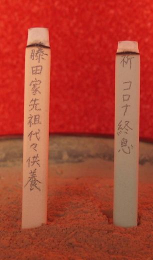 新しいタイプのお線香です。 長さ12センチ、幅8ミリ、厚さ4ミリの扁平な棒状線香に、鉛筆で文…