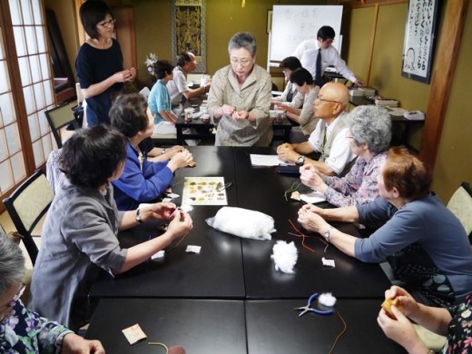 講師は、例によって表町の仏具店「三香堂」さんです。たくさんの素材と道具を持ってお出でいただきました。妙勝寺信楽会の参加者は20名。当初10名程度の申し込みを予想していたのですが、大人気でした。