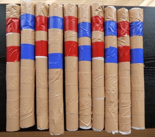一日分の新聞紙を丸めて、ガムテープでとめ、左右が分かるようにカラーテープを巻いています。