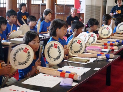 「ツクツクドンツクドンドン」のリズムに合わせて、赤と青のテープを巻いた2本のバチを両手で上手に動かします。最初はなかなか難しいようでしたが、みるみる上達しましたので、順番に大太鼓を本物のバチで叩いてみました。皆さんそれぞれ、上手にできました。