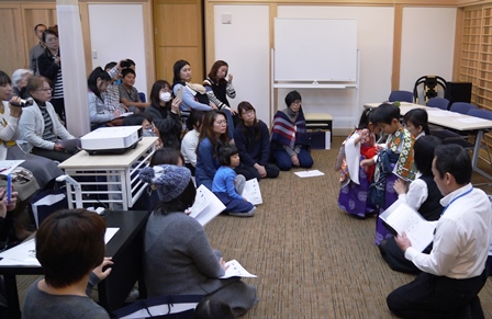 当日の日程説明の後、実際に稚児衣装を着ける実演。