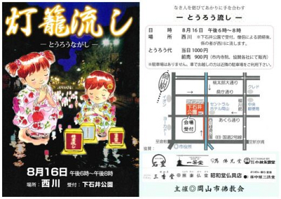 今年も8月16日、西川にて岡山市佛教会主催の「灯籠流し」が開催されます。 「灯籠流し」は、…