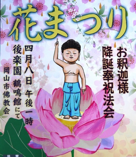4月8日(水)、午後1時~3時、岡山市佛教会主催の「花まつり」が、後楽園鶴鳴館にて行われます。