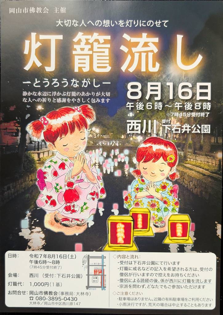 今年も8月16日、西川にて岡山市佛教会主催の「灯籠流し」が開催されます。