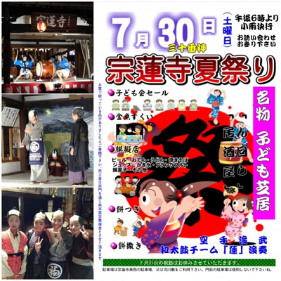 今年もやってきます! 「宗蓮寺夏祭り」 子ども会によるバザー (売り上げは熊本へ寄付) 出店…