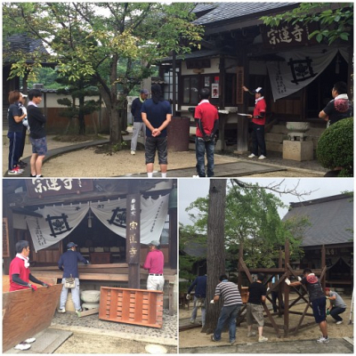宗蓮寺夏祭りの準備 芝居の舞台作りや やぐらの組み立て… 宗蓮寺子ども会保護者の ご協力によ…