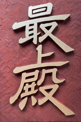 最上殿の扁額(へんがく)が掘り上がり彩り(いろどり)されました。 木は欅(けやき)で掘るのも固くて…
