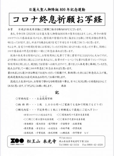 コロナ終息祈願お写経はじめています。 ご要望のかたは、住所をメール頂くかお電話などでご連絡頂…