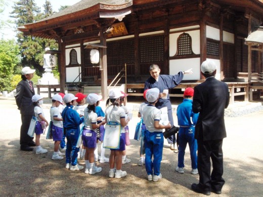 5月13日、地元の大和小学生が見学に来ました。ここ数年、小学校の課外授業で地元を学ぶと言う事で、毎年小学生が見学に来てくれます。いつも元気な挨拶に始まり、お寺の歴史や建物の事をお話します。子供にわかり易く話をするのは難しいのですが勉強になります。