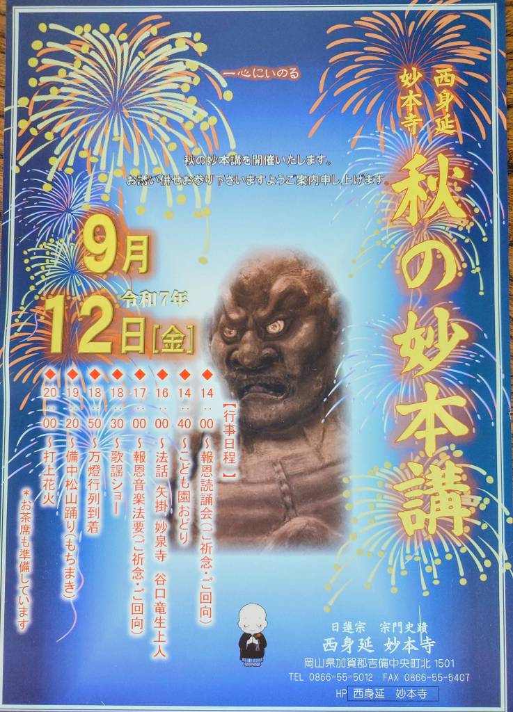 秋の妙本講開催!!! ブログ 記事公開日:2025年09月08日 9月12日(金)秋の妙本講を開催いたします。 今年も14時と17時の報恩法要を行い、こども園の踊り、歌謡ショー、万灯行列、妙本寺音頭、盆踊り、そして打ち上げ花火と盛大に執り行います。 お誘い合わせお参り下さいますようご案内申し上げます。 PREV NEXT 一覧へ