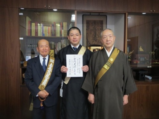 辞令の交付を総長様から直々に拝受し、改めてその任の重さを実感じています。図らずも大覚大僧正の650遠忌の正当に、この栄誉を頂けたことは、歴代の住職を中心に地域の方々が信仰を大切に継承してきた賜物だと実感しています。今後はその名に恥じぬように檀信徒を始め地域の方々と共にお寺の護持に精進して参りたいと思っています。