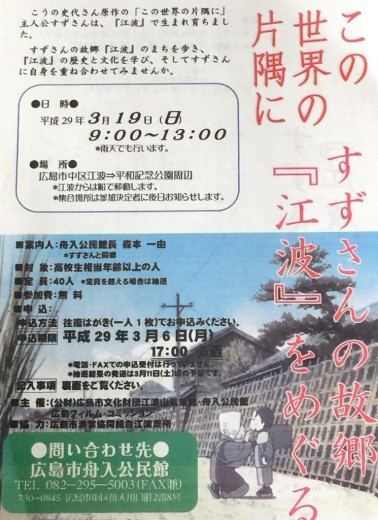 3月19日、舟入公民館主催の【すずさんの故郷『江波』をめぐる】に参加しました。40名定員のところ、14…