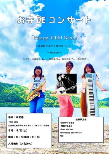 広島の大学生4人組ユニットによるコンサートが、秋のお彼岸法要後に本覚寺本堂で行われます。 …