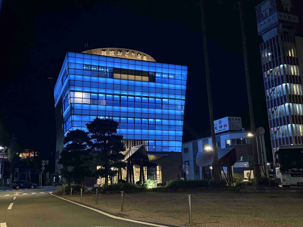 今年も近所の「阿波おどり会館」が、先月のピンクに続いてブルーにライトアップされています。