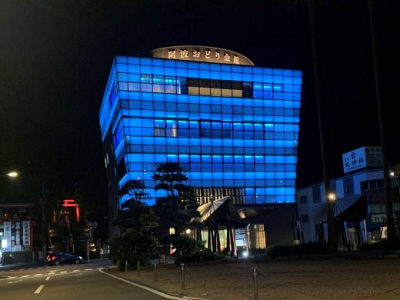 当寺近くの「阿波おどり会館」が先月のピンクに引き続き月初めからブルーにライトアップ…