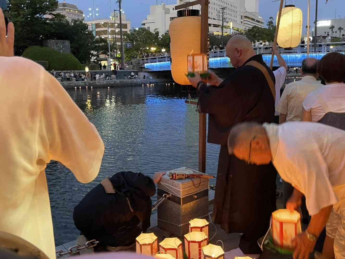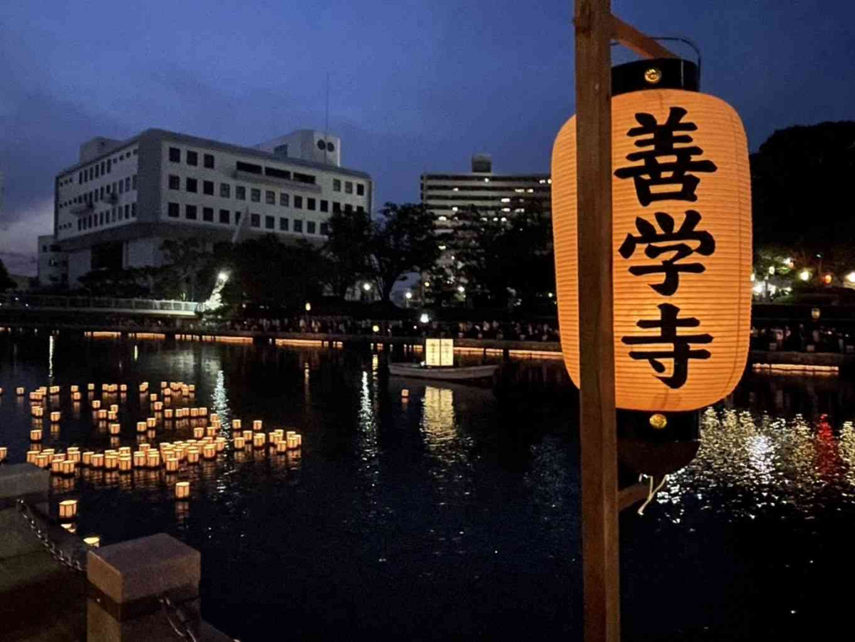 お盆の最終日である8月16日(土)、お迎えした各家の諸霊をお送りする「灯ろう流し(徳島市仏教会主催)」が藍場浜公園近くの新町川で営まれ、大勢の参加者のもと約4000灯の灯ろうが流されました。
