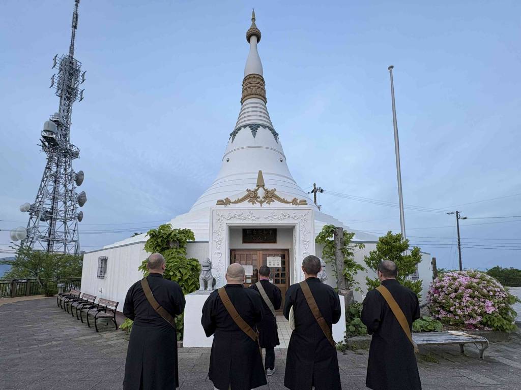 暁天唱題を終えた後、同じく山頂にあり最近補修工事を終えた「平和祈念塔パゴダ(徳島県仏教会所管)」で、太平洋戦争戦没者のご供養と世界平和のご祈念を行いました。