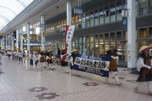 晴天の中、15時に開始された行脚ですが、アーケードを通っている最中、にわか雨が降りました。