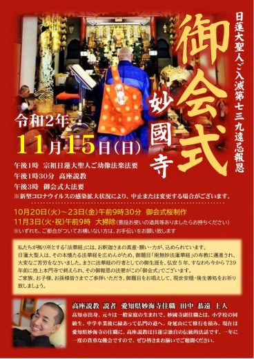 11月15日、少し汗ばむくらいの陽気の中、宗祖日蓮大聖人第739遠忌お会式法要が行われました。 …