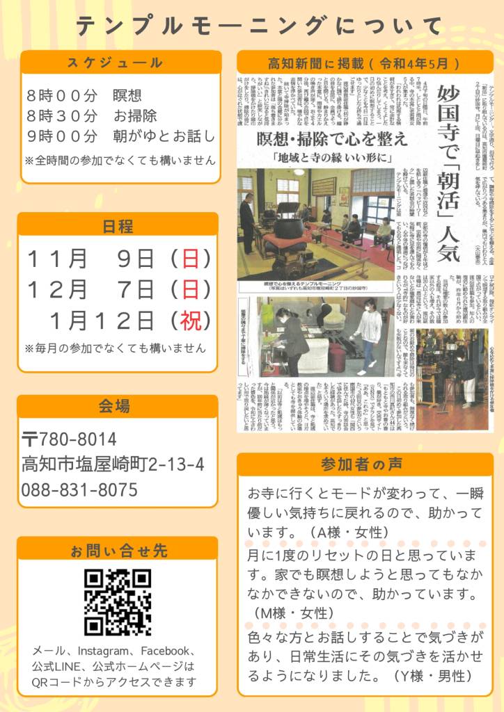 12月のお寺で朝活 イベント・活動 記事公開日:2025年12月06日 開催日:2025年12月07日 12月7日(日)はテンプルモーニングの日 妙國寺では、朝活を行っております。 マインドフルネス瞑想 お掃除 ハッピーワーク 令和4年9月からの試みですが朝がゆをみんなで食べようと思います! 12月7日(日) 8時~9時30分頃まで ご不明な点、ご不安な点がございましたらお気軽にお問い合せくださいませ。 ◇椅子席にてご案内します ◇タオルやハンカチをご持参ください ◇予約不要 ◇駐車場完備 PREV NEXT 一覧へ
