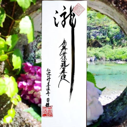 このご首題では「直下三千丈」の詩をお題目に変えており、瀧の 飛沫が、轟音が自然と身に染み入るように、お題目の功徳が皆様に届くことを祈っております。
