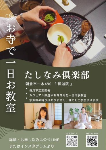 また、寺ヨガやカジュアルな茶道が楽しめる大人の1Day教室「たしなみ倶楽部」も毎月不定期で開催中。