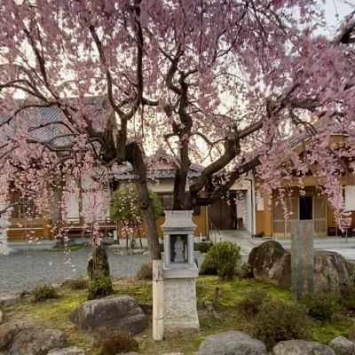 【釈迦院の枝垂れ桜】 釈迦院参道の正面にたたずむ枝垂れ桜。 今から六十年前に、開基法尼が…
