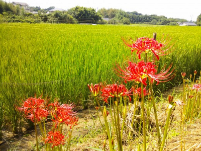 実り出した稲穂の脇道に、真っ赤な帯のアクセントが出来てきました。 今年も秋のお彼岸を前に、…