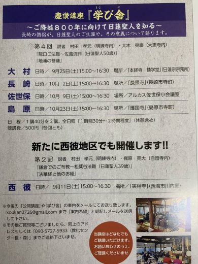 先日もお知らせしておりましたが、10月9日(土曜日)15時より、アルカス佐世保にて日蓮聖人ご降誕800…