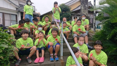 本光寺境内でスイカを食べる子どもたち!(^^)!