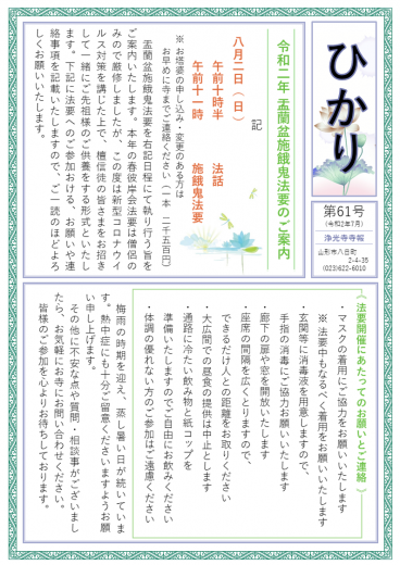 寺報発行のお知らせ イベント・活動 記事公開日:2020年07月25日 この記事は最終更新日から1年以上経過しています。記事の内容やリンク先については現在と状況が異なる場合がありますのでご注意ください。 2020年7月に発行した寺報第61号になります。 下記リンクよりPDFファイルをダウンロードしてご覧ください。 2020年7月号 この記事は最終更新日から1年以上経過しています。記事の内容やリンク先については現在と状況が異なる場合がありますのでご注意ください。 PREV NEXT 一覧へ