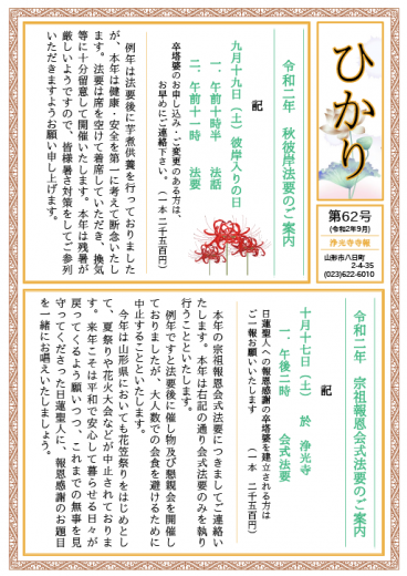 寺報発行のお知らせ イベント・活動 記事公開日:2020年09月01日 この記事は最終更新日から1年以上経過しています。記事の内容やリンク先については現在と状況が異なる場合がありますのでご注意ください。 2020年9月に発行した寺報第62号になります。 下記リンクよりPDFファイルをダウンロードしてご覧ください。 2020年9月号 この記事は最終更新日から1年以上経過しています。記事の内容やリンク先については現在と状況が異なる場合がありますのでご注意ください。 PREV NEXT 一覧へ